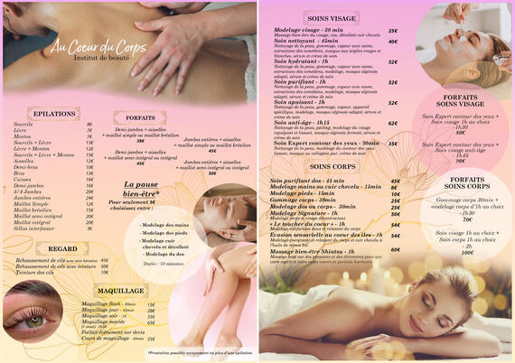 Aucune Prestation de Beauté ne sera fournie dans le cadre de carte Cadeaux Au Coeur du Corps dont la durée de validité sera expirée, cette durée ne pouvant en aucune manière être prolongée.Article 4 : Formation du contratRappel : Tout achat de Prestations de Beauté et/ou de cartes Cadeaux Au Coeur du Corps dans l'institut de beauté suppose l’adhésion sans restriction ni réserve aux présentes conditions générales de vente.4.1 – Dès lors que l’acheteur a enregistré sa commande en cliquant sur l’icône « Valider votre commande », ou valider son rendez-vous et/ou son achat par téléphone ou directement dans l'institut de beauté Au Coeur du Corps, il est considéré comme ayant accepté en connaissance de cause et sans réserve les présentes conditions générales de vente, les prix, volumes et quantités de Prestations de Beauté et /ou cartes Cadeaux Au Coeur du Corps proposés à la vente et commandés.4.2 – Au Coeur du Corps recommande à l’Acheteur de conserver ses informations et détail de commande sur un document papier ou informatique.Article 5 : Prix et modalités de paiement5.1 – Le prix des Prestations de Beauté et des cartes Cadeaux Au Coeur du Corps sont ceux en vigueur au moment de la validation de la commande par l’Acheteur.Les prix exprimés en Euros ne comprennent pas la taxe sur la valeur ajoutée (T.V.A), car nous sommes exempté de la T.V.A.A noter : Les prix des Prestations de Beauté et des Chèques Cadeaux Au Coeur du Corps peuvent être modifiés par Au Coeur du Corps à tout moment.5.2 – La totalité des Prestations de Beauté et/ou carte Cadeaux sera payables en Euros, directement à l’institut par :_ Carte de paiement (Visa, mastercard...)_ Espèces_ ChèqueLes cartes Cadeaux Au Coeur du Corps sont payables en Euros, comptant, lors de la commande, par :